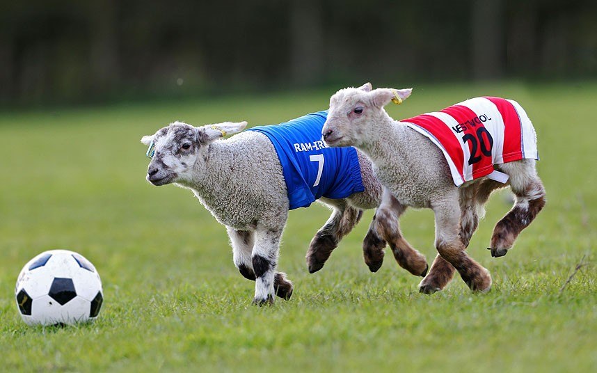 А на этом кадре засняты ягнята-предсказатели. С их помощью угадывают победителя матча английской премьер-лиги. Играть между собой будут клубы "Челси" и "Ливерпуль".