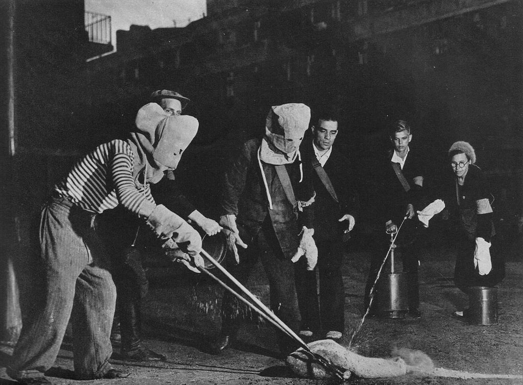 Пташкина (справа на фото) - героическая женщина, которая смогла убрать с крыши 35 зажигательных бомб за одну ночь. Она инвалид, но отказалась эвакуироваться и организовала бригаду для борьбы с огнем, состоящую из одних школьников. На фото они посыпают учебную бомбу песком и поливают водой из шланга. Пташкина была награждена медалью и премией в 500 рублей.