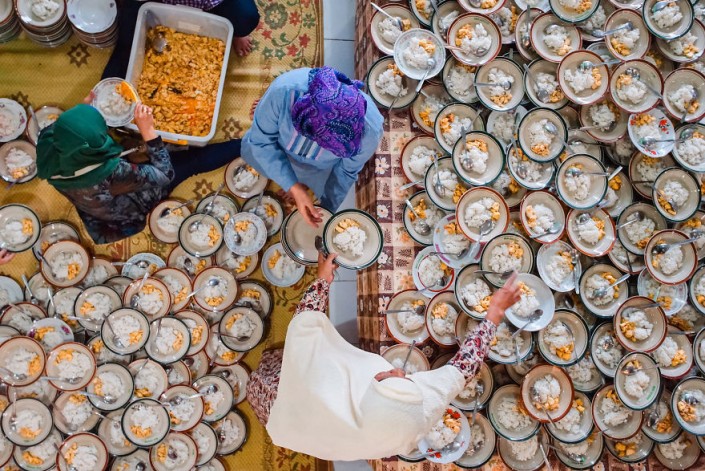 Женщины наполняют тарелки едой, приготовленной для ифтара - вечернего ужина, во время которого мусульмане заканчивают свой ежедневный пост Рамадан. @Dharmaku (Индонезия), Дхарма Курниаван
