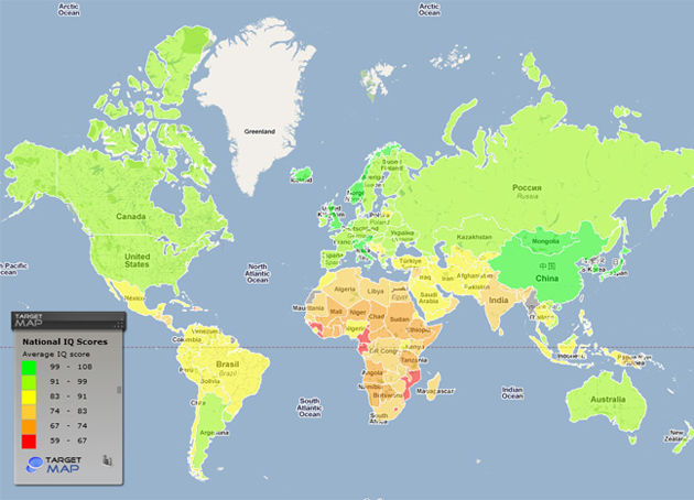 Один из самых неприятных показателей для одних и предмет гордости для других. Эта карта по 113 странам мира составлена по итогам исследований профессора психологии Ричарда Линна и профессора политических наук Тату Ванханена. Страной с самым высоким IQ на ней оказался Сингапур. А вот в книге тех же авторов "Коэффициент интеллекта и богатство народов", вышедшей в 2002 году, почетное первое место занимал Гонконг, Сингапур же стоял на пятом. Самое последнее место было у Экваториальной Гвинеи с ее усредненным IQ, равным 66.