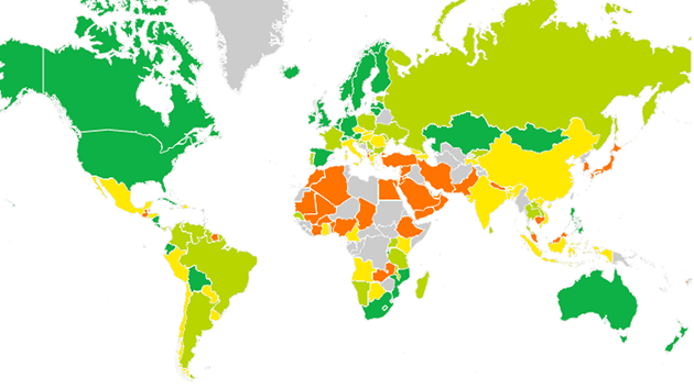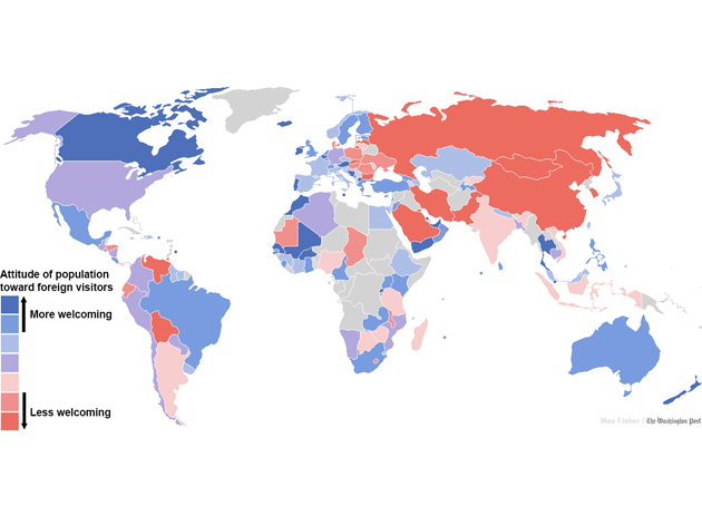 Очень интересная карта, составленная по докладу о тенденциях в сфере глобального туризма, опубликованному в рамках Всемирного экономического форума (ВЭФ), прошедшего в 2013 году. В течение года специалисты ВЭФ обращались к жителям разных стран с одним и тем же вопросом: "Насколько желанны иностранные гости в вашей стране?" И получили весьма ожидаемые результаты. Оказалось, что в России, Боливии и Венесуэле гостей из других стран ждут меньше всего. Самыми гостеприимными оказались Исландия, Новая Зеландия и Марокко. Казахстан в этом списке, как видно, также относится к группе гостеприимных стран.