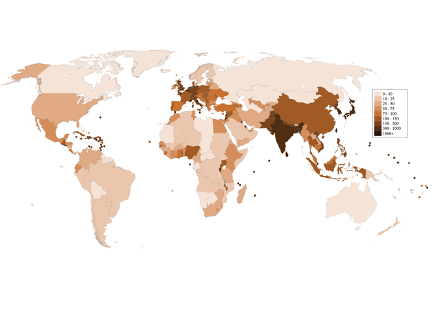 А вот эта карта известна многим, ведь все знают, что наиболее многочисленными народами на сегодняшний день считаются индийцы и китайцы, что и показывает карта. Впрочем, в пятерку самых "тесных" стран по понятным причинам вошли Монако, Сингапур, Ватикан, Мальта и Мальдивы.