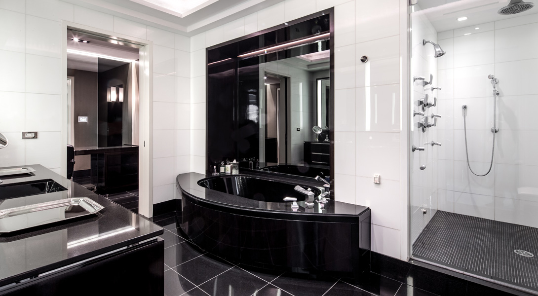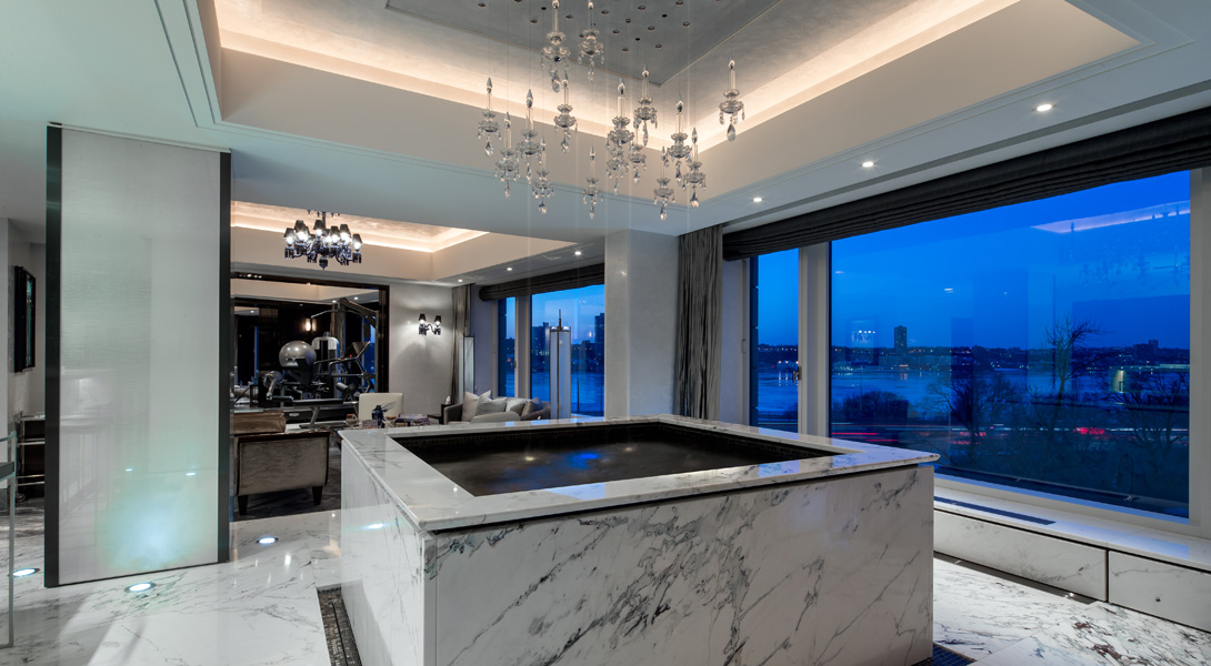 Особой гордостью квартиры является система безопасности Crestron, которая в автоматическом режиме контролирует посетителей, освещение, ТВ, джакузи и прочее.