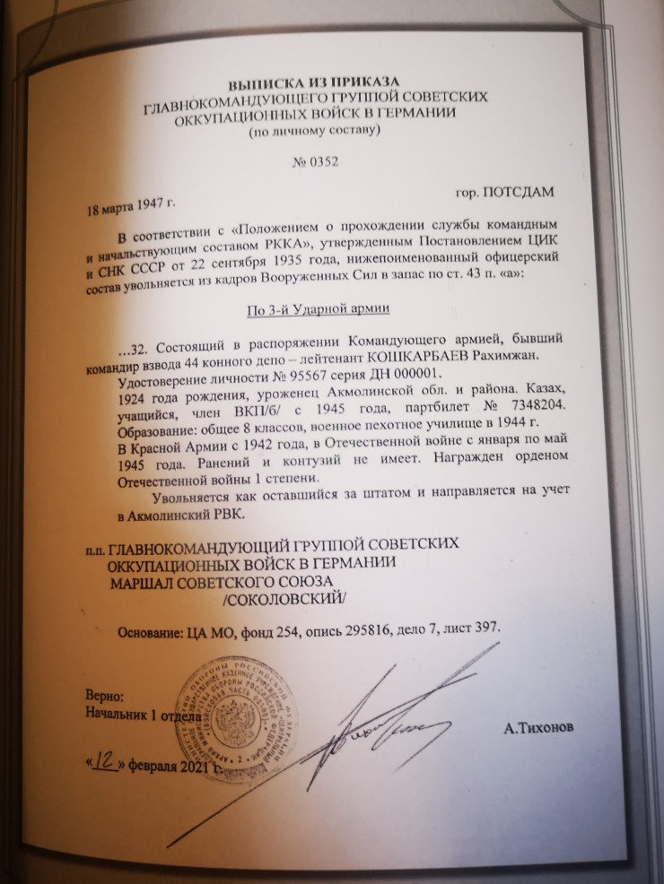 "Выпускник Фрунзенского военного пехотного училища младший лейтенант Кошкарбаев Рахимжан назначается командиром стрелкового взвода. В действующей армии с января 1945 года. Наград и ранений не имеет. Назначается с 15 февраля 1945 года вместо младшего лейтенанта Кордюкова Алексея Юрьевича, погибшего в бою 15 февраля 1945 года", - говорится в документе.