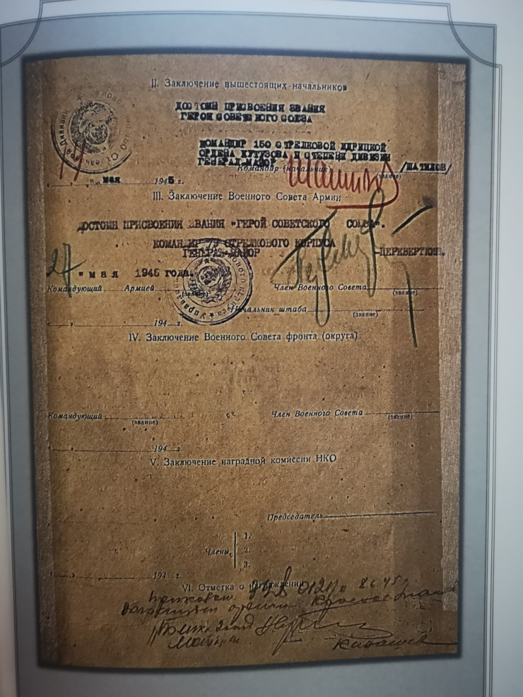 Судьба наградного листа за 6 мая 1945 года известна. 14 мая в нем появляется отметка о награждении орденом Красного Знамени.