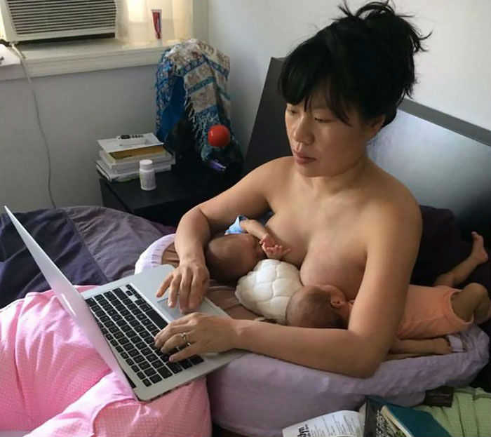Художница из Бруклина Хаин Кох решила ответить на заявление Марины Абрамович. Она разместила фотографию в Facebook, на которой кормит грудью своих детей и одновременно работает.