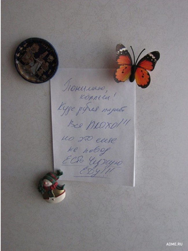 Как разнообразить серые будни в офисе и скрасить тяжелый рабочий день? Можно попить чаю со сладостями, поболтать с коллегами или можно написать смешную записку своим "офисным товарищам". AdMe.ru собрал лучшие свидетельства того, что офисные сотрудники отлично умеют бороться со скукой.