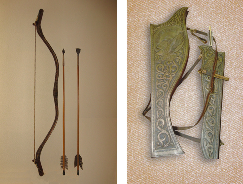 Основным метательным оружием были лук и стрелы. Боевой лук собирался из нескольких частей, изготовленных из различных материалов: дерева, кости, рога, бересты, сухожилий и кожи. Наконечники стрел имели различную форму: четырехгранные, которые могли пробить любой щит и деревянные цилиндрические, применяемые для сбивания человека с коня. Колчан для ношения стрел назывался "корамсак", отдельный футляр для лука - "садак". Этим же термином обозначался весь набор с налучем, колчаном и портупеей для их ношения.