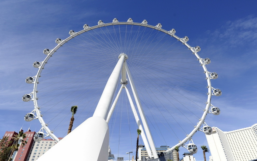 В Лас-Вегасе открылось самое высокое на планете колесо обозрения. Называется оно - HighRoller, его высота - 165 метров. Колесо состоит из 28 стеклянных кабин с кондиционерами, в каждой помещается 40 человек. Полный оборот гигантское колесо совершает за полчаса. Билеты стоят 24,95 доллара днем и 34,95 - ночью.