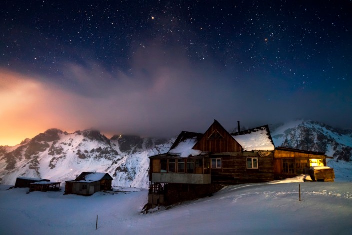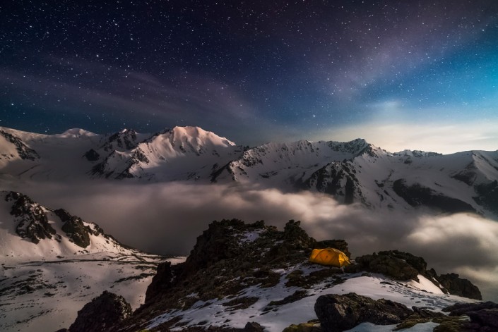 Ночь на гляциологической станции Т-1. Цирк ледника Туюк-Су, Малое Алматинское ущелье, Заилийский Алатау. Январь, 2019 год. © Ольга Кулакова.
