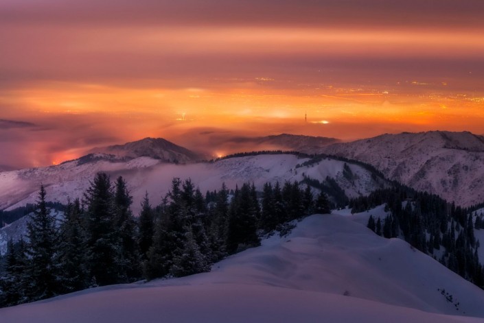 Вид на ночной Алматы. Ущелье Кимасар, Заилийский Алатау. Декабрь, 2016 год. © Ольга Кулакова.
