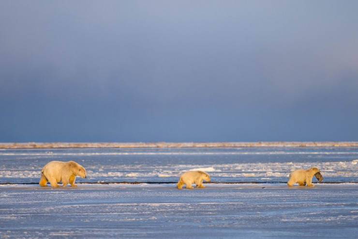 Мама-медведь гуляет с двумя медвежатами. Автор фото признается, что, увидев этих животных, он испытал чувство опасности и тревоги, в то же время ощущались сила и величие, исходящие от них. Медведи уверенно шли вперед.