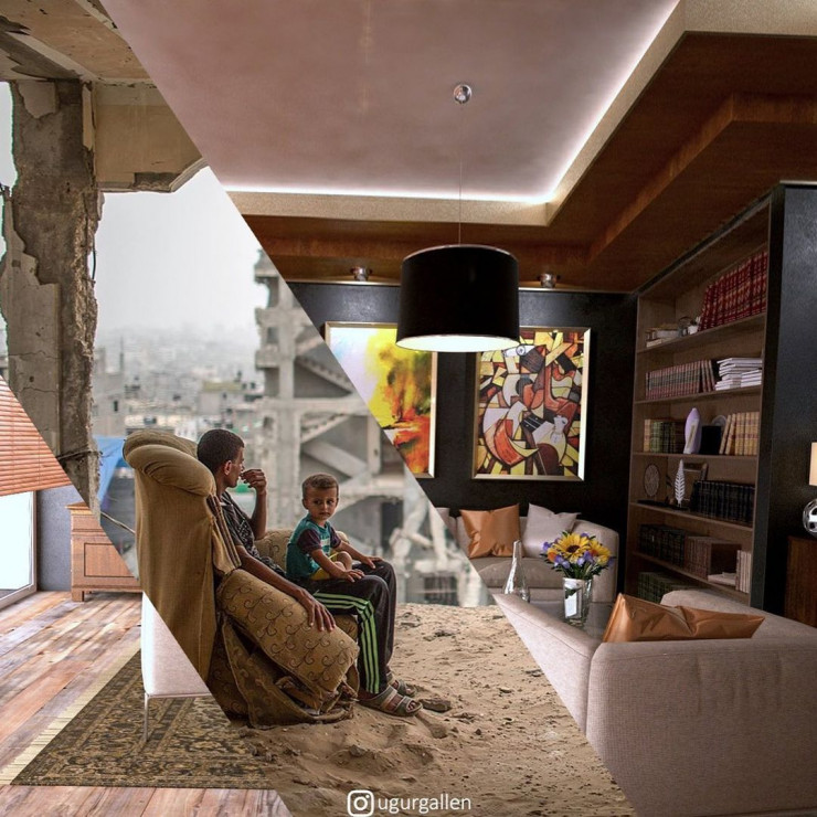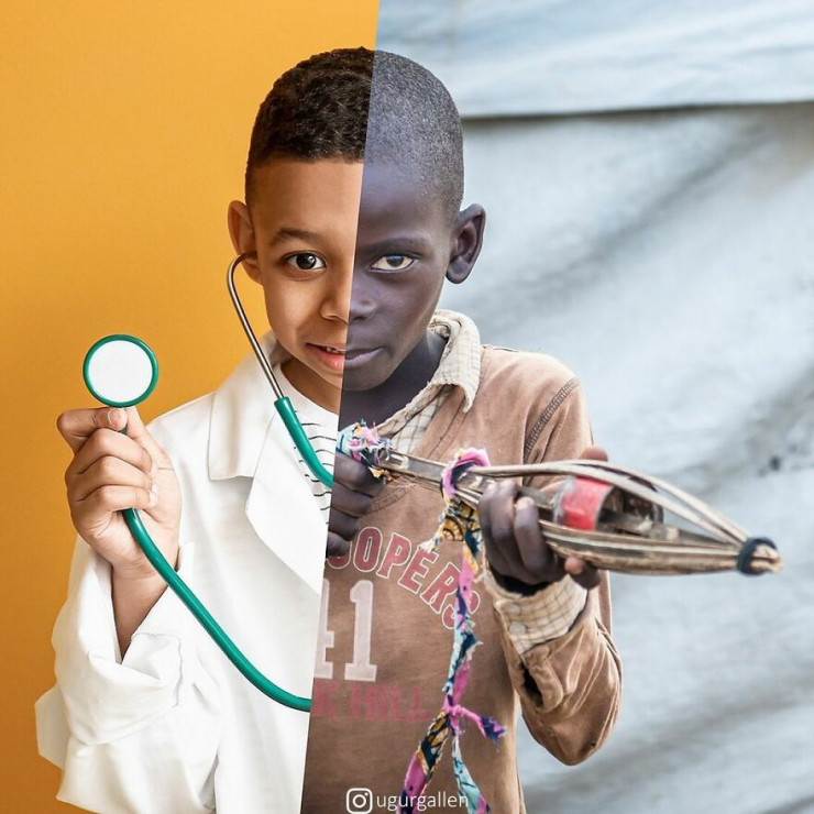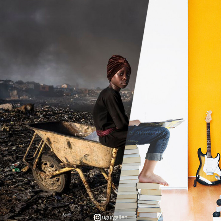 "Я создаю коллажи из двух изображений, соединяя работы самых бесстрашных современных фотожурналистов. Пытаюсь поднять важные проблемы, с которыми сталкивается мир: социальная несправедливость, войны, изменение климата и т. д. Стремлюсь показать контрасты между двумя разными мирами, в которых мы живем", - говорит Угур.