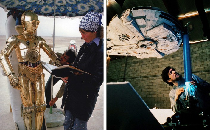 Слева: Энтони Дэниелс в костюме C-3PO повторяет текст с продюсером Энн Скиннер. Справа: член съемочной группы подготавливает модель Ты­ся­че­лет­него сокола.