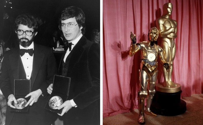 Слева: Джордж Лукас и Стивен Спилберг с премиями Гильдии режиссеров Америки, 11 марта 1978 года. Справа: C-3PO на 50-й церемонии вручения наград премии "Оскар", 1978 год.