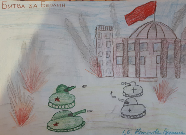 "Битва за Берлин была одной из последних операций, которая продолжалась с 16 апреля по 8 мая 1945 года. В ходе этой операции советские войска с огромным трудом вошли в город. Оборона Берлина была очень хорошо продумана и подготовлена. Бои шли за каждый дом, за каждую улицу! Они не прекращались ни ночью, ни днем. В городе было собрано большое количество орудий, минометов, "Катюш" и танков. И благодаря накопленному опыту и превосходству в силе советские войска смогли приблизиться к Рейхстагу. К зданию пытались пробиться очень много штурмовых групп. К вечеру 30 апреля два героя - Рахимжан Кошкарбаев и Григорий Булатов смогли под непрекращающимся обстрелом пробиться к зданию и водрузить знамя! К утру 2 мая гарнизон Рейхстага капитулировал. Берлинская операция нанесла последний сокрушительный удар по войскам противника, и спустя шесть дней после падения Берлина германское руководство подписало акт о безоговорочной капитуляции Германии".