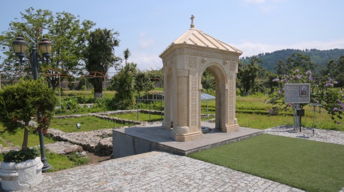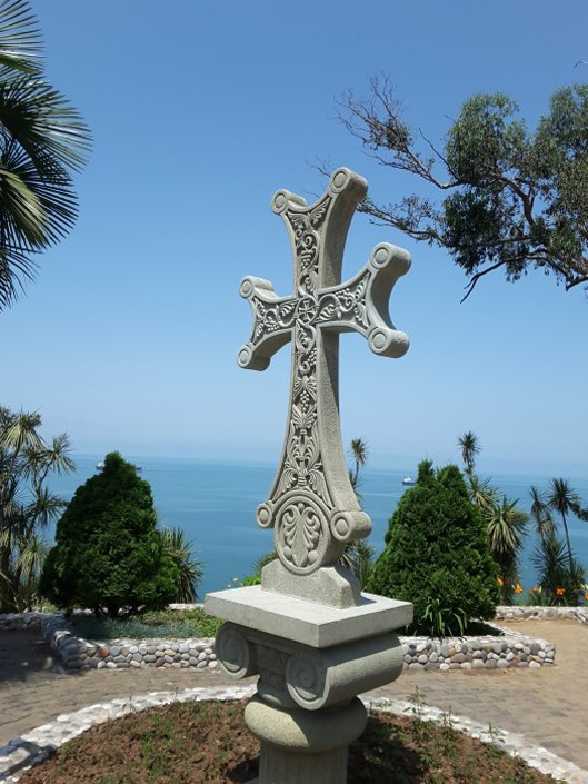 В Ботаническом саду не обошли и тему христианства. На вершине находится крест с расширяющимися рукавами (Болнисский крест), он наиболее широко известен и используется в Грузии с V века. А почему на нем изображена виноградная лоза расскажем вам ниже...