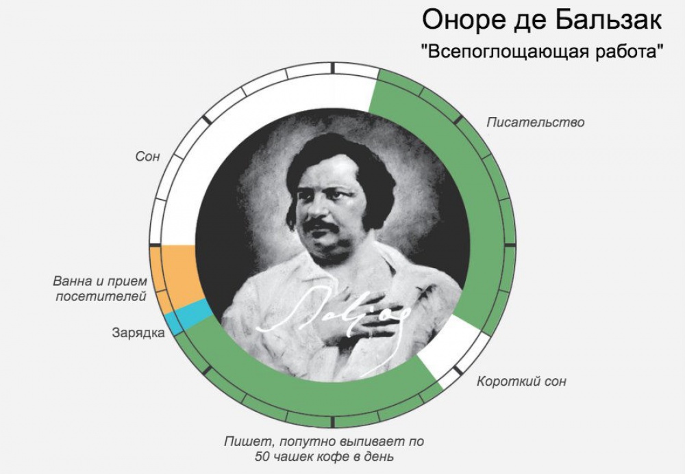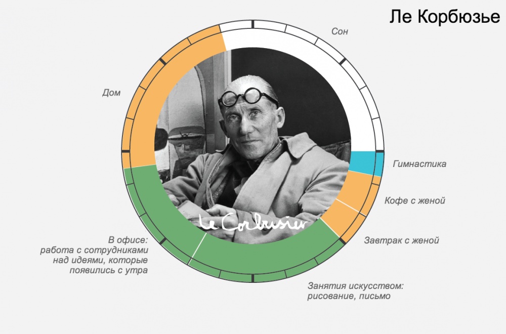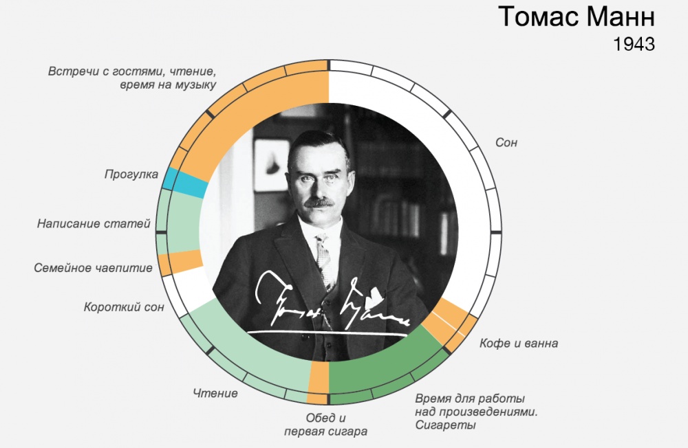 Дизайнеры Info we trust составили режим дня нескольких великих людей на основе их мемуаров. Писатели, музыканты и ученые умели распоряжаться своим временем таким образом, чтобы успеть самое главное и оставить след в истории.
