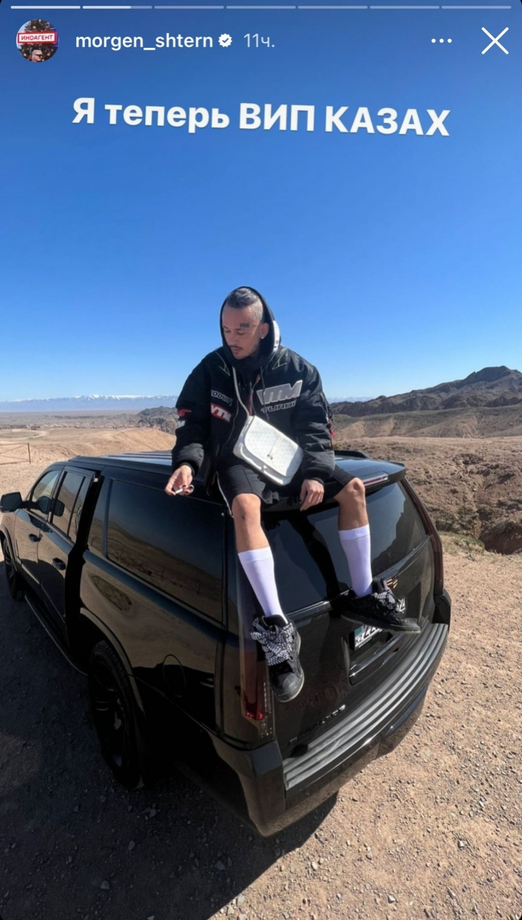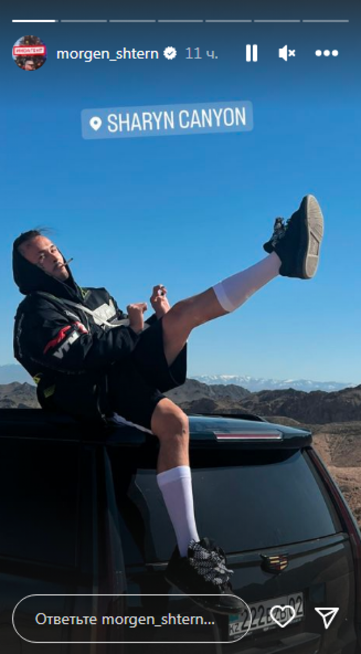 В качестве доказательства своего пребывания в Казахстане исполнитель опубликовал в сториз своего Instagram фотографию с геотегом Sharyn Canyon. На снимке Моргенштерн сидит на черном внедорожнике с казахстанским номером на фоне характерного пейзажа.