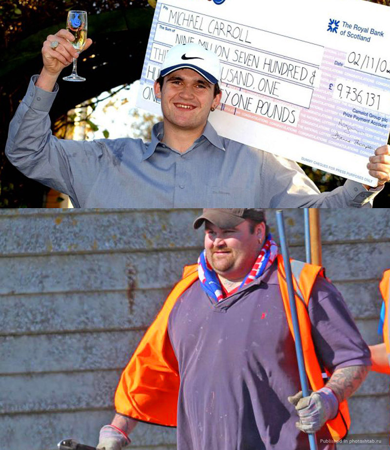Майкл Кэррол. Глупее, чем этот человек, просто невозможно распорядиться своим 15-миллионным выигрышем в лотерею. Безработный 26-летний британец пошел в супермаркет, чтобы купить бутылочку пива, но у него не хватило денег, и тогда он купил два лотерейных билета. Под одним из них красовалась надпись "Джекпот", который в то время составлял 15 миллионов долларов. Сначала он стал дарить дорогие подарки семье и друзьям. После этого он стал тратить деньги на вечеринки, кокаин, машины и проституток. Уже через год он стал тратить по 2 тысячи долларов в день на кокаин, проводя различные вечеринки в своем новом доме. После того, как от Майкла ушла жена, к его пристрастиям добавилась еще и продажная любовь, за восемь лет он потратил на проституток в общей сложности около 200 тысяч долларов. Так же он потерял 1 миллион долларов на ипподроме и 2 миллиона, сделав ставку на свою любимую футбольную команду "Глазго Роджерс". Свои последние 600 тысяч долларов он потратил в 2008 году. Позже, чтобы расплатиться с долгами, он продал свой роскошный автопарк и всю недвижимость. Сегодня Майкл Керрол работает мусорщиком и зарабатывает 5 долларов в час. По его словам, сейчас его жизнь значительно легче и проще, чем когда он был миллионером.