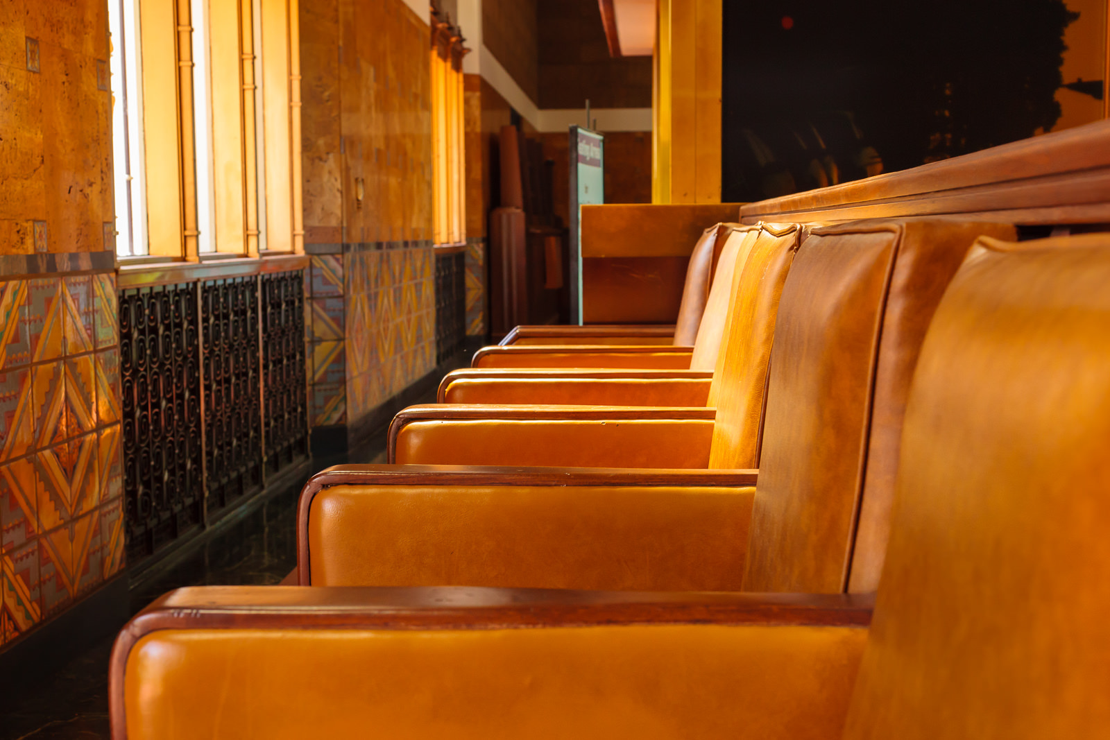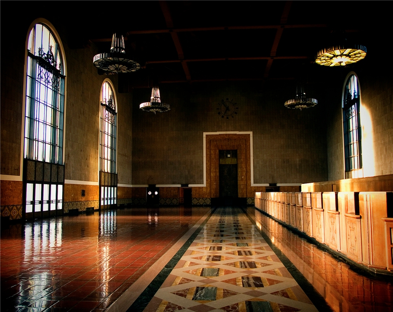 В работе над проектом этого здания отец и сын, Джон и Дональд Паркинсоны, использовали смешение испанского колониального стиля и современного на тот момент стиля ар-деко. Высокий белый колониальный потолок вокзала напоминает старую Калифорнию, в то время как его главный зал ожидания роскошно декорирован окрашенной древесиной по стенам и разноцветными мраморными вставками на полу. В солнечный день, кроме того, можно прогуляться на открытом воздухе во дворе, среди окруженных заботой роз и фонтанов, декорированных мозаикой.