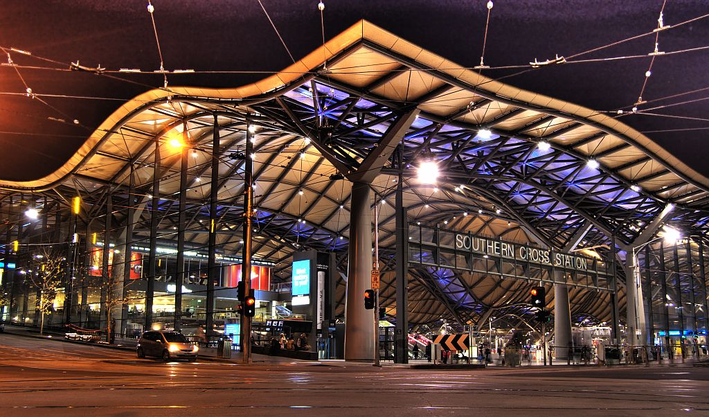 Носивший ранее название Спенсер Стрит, этот вокзал стал называться Саутерн Кросс после сложной модернизации в 2005 году. Его волнистая крыша простирается на целый квартал и напоминает плавающее по воздуху одеяло, установленное на Y-образных колоннах. Форма крыши предусматривает и вентиляцию: в ней есть специальные отверстия, куда уходит застоявшийся в помещении воздух. В западной части станции, кроме того, обратите внимание на красочную настенную роспись, посвященную истории транспорта: она была впервые установлена в 1978 году, затем удалена и восстановлена снова после реконструкции.