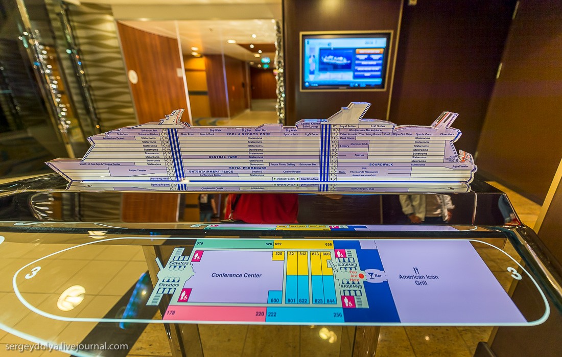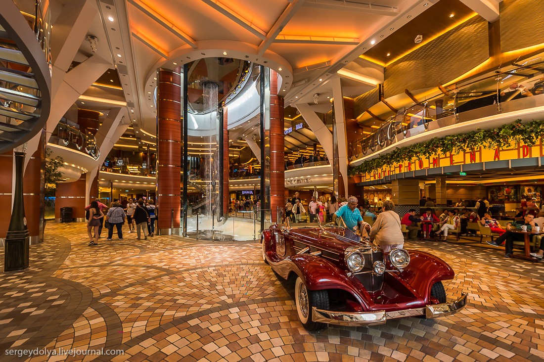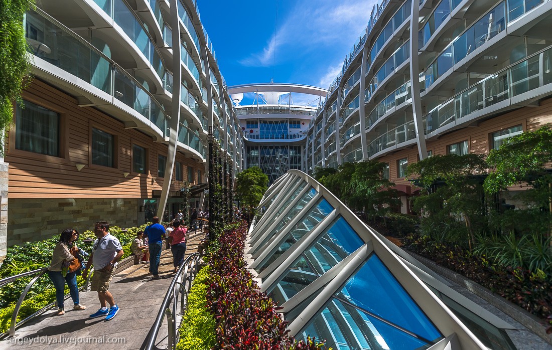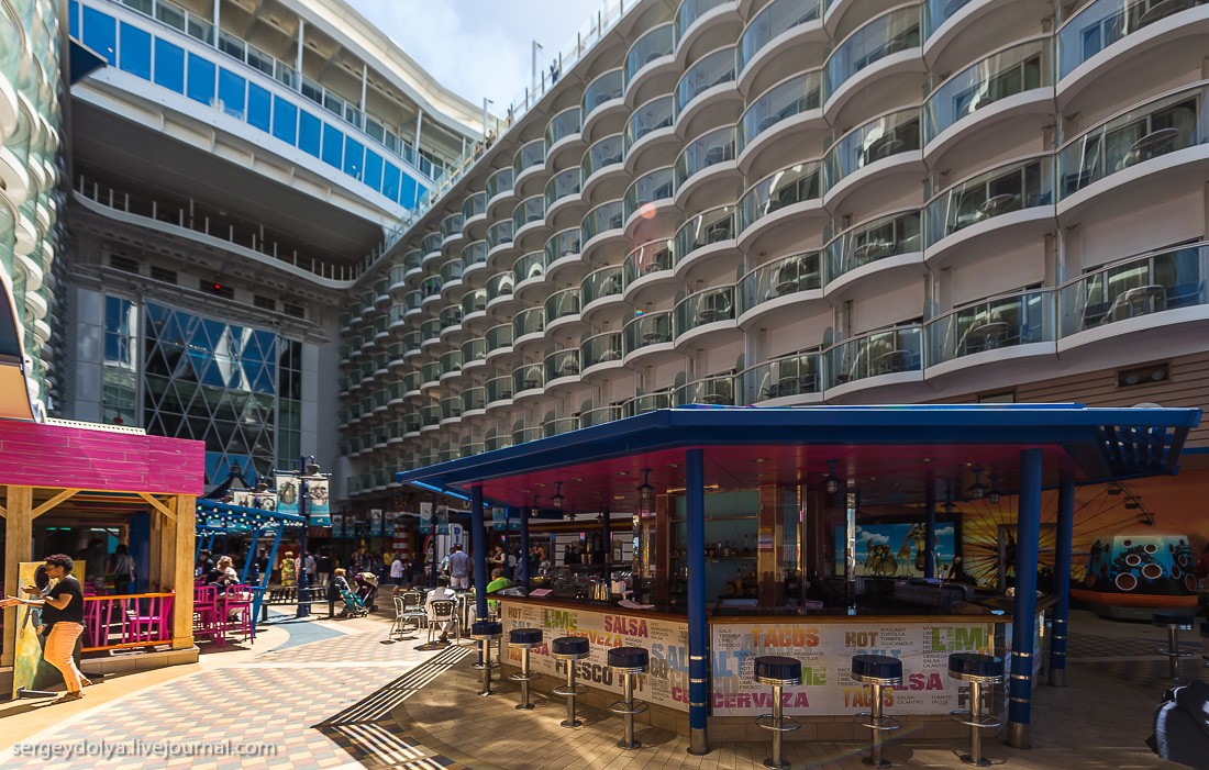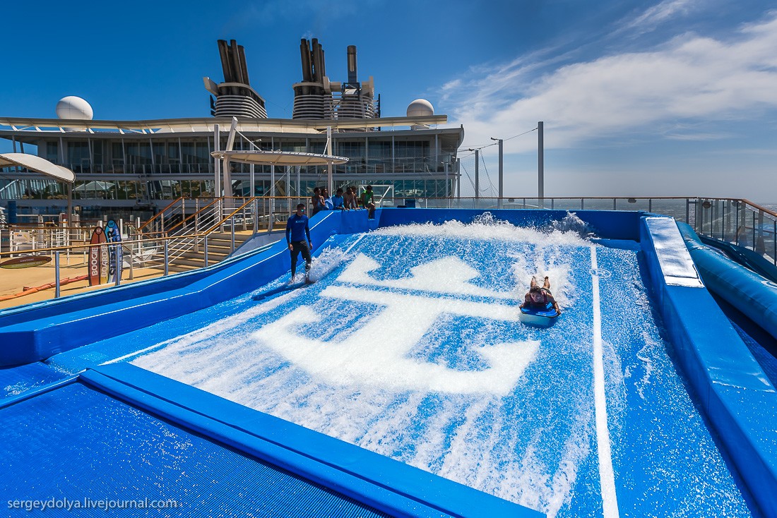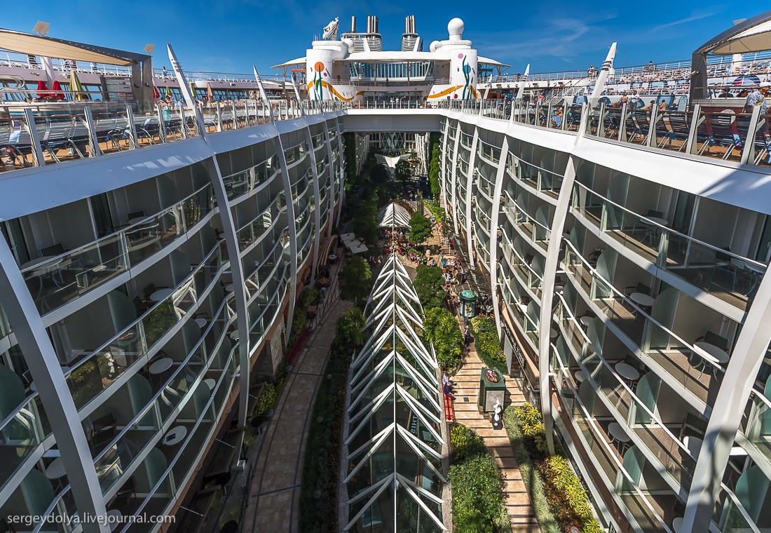 Рассказывает блогер Сергей Доля: "Представьте себе квартал Лас-Вегаса, который плывет из города в город. Представьте корабль на 7500 человек, из которых 2500 - сотрудники и персонал. Добавьте к ним ледовый каток, волейбольные и баскетбольные площадки, поле для гольфа, зал для боулинга, стены для скалолазания, фитнес-центр, SPA-салон, бесконечные бассейны и вы получите самый большой круизный лайнер в мире - Allure of the Seas".