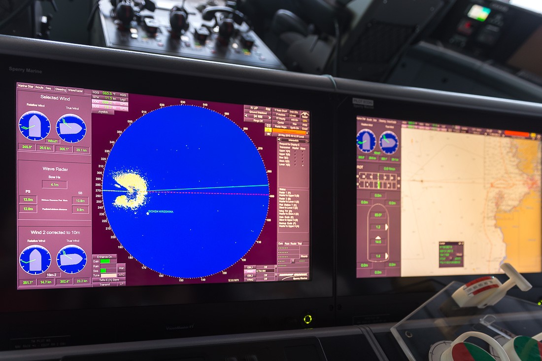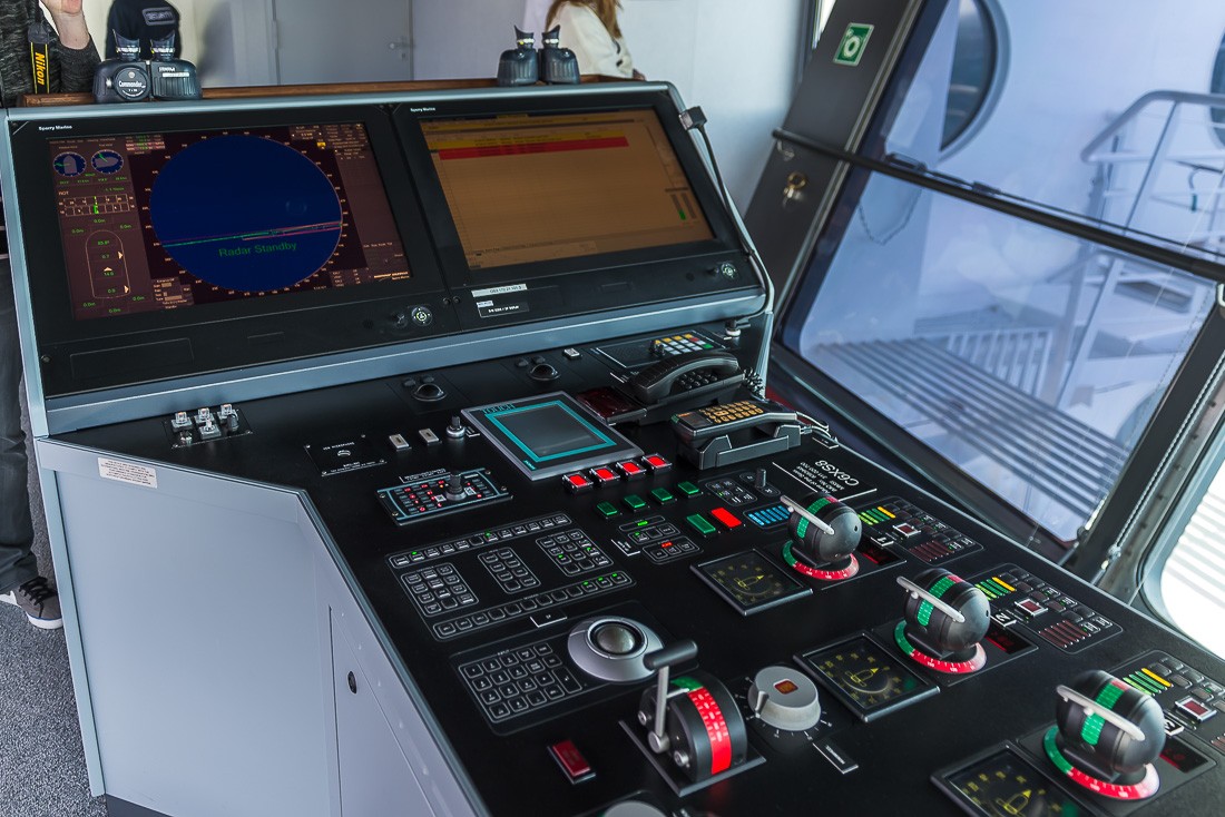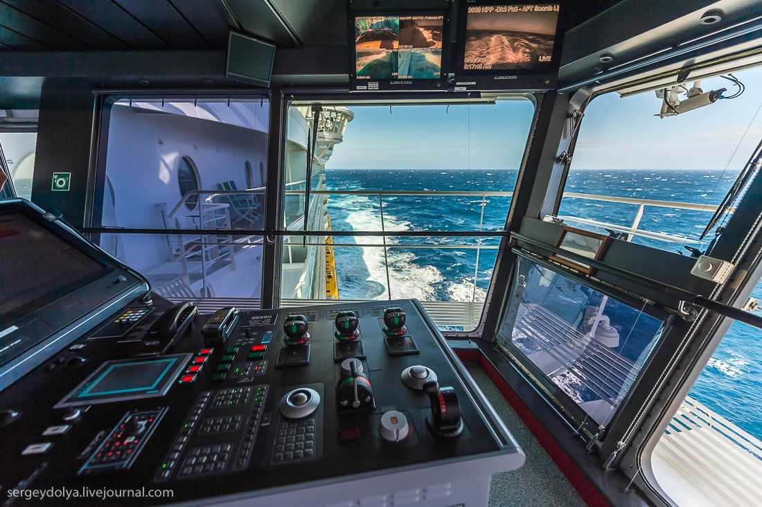 У корабля нет штурвала. Три винта двигателя вращаются на 360 градусов, их выставляют либо вручную с помощью трех вращалок (на переднем плане фотографии), либо с помощью компьютера. Система следит за курсом и подруливает.