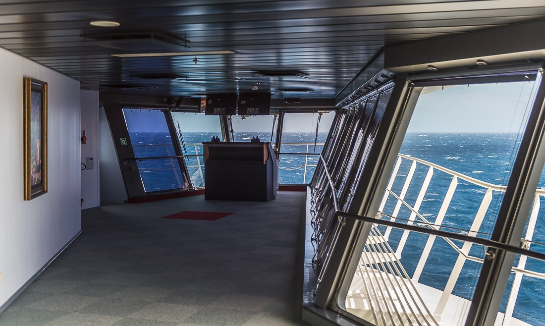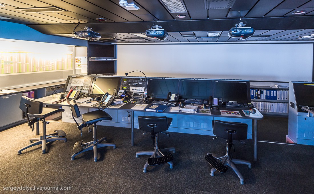 На капитанский мостик нет экскурсии, но мне повезло плыть вместе с группой испанских журналистов. Их визит был согласован, и мне удалось примазаться к этой компании. Капитанский мостик выглядит пустовато. Огромная площадь, но органы управления занимают лишь небольшой участок по центру. Кораблем управляет не капитан, а первый офицер. Он нам и проводил экскурсию. Офицера зовут Геннадий. Он из Одессы. Наш хлопчик.