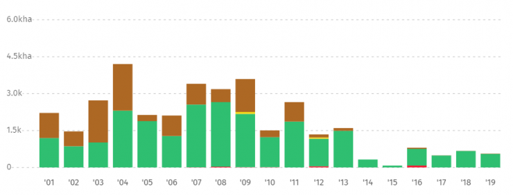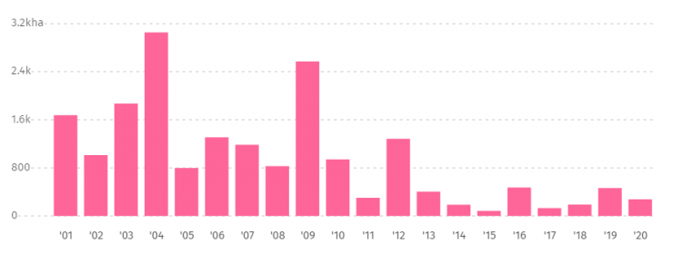 В Алматинской области за последние 19 лет также наблюдается сокращение лесных угодий. Наибольшая потеря лесного покрова размером в 727 гектаров произошла в Балхашском районе по сравнению со средним показателем в 165 гектаров. В 2021 году в регионе сгорело 12 тысяч гектаров земли.
