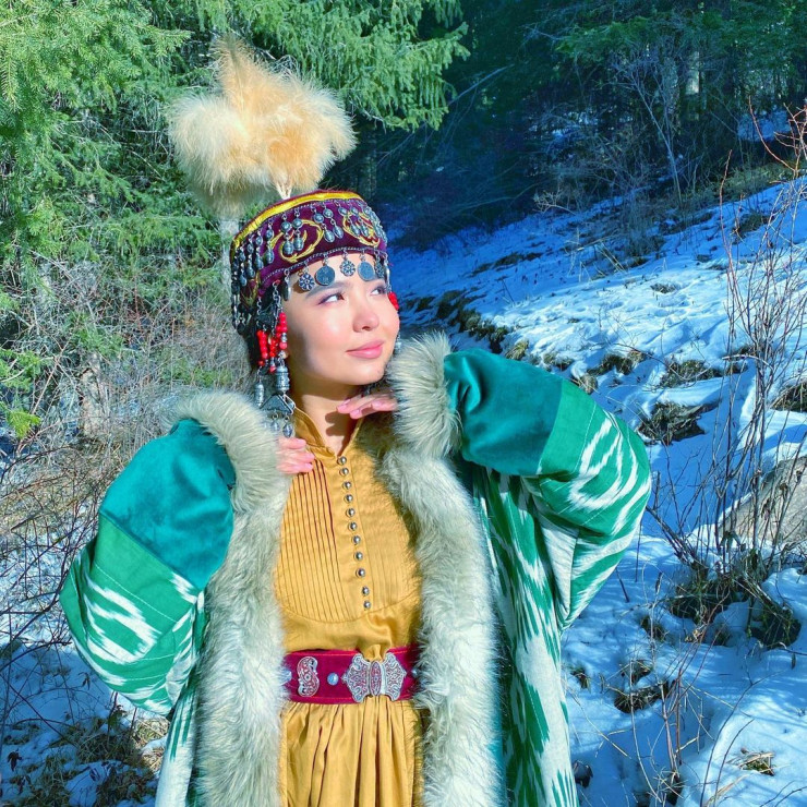 "На этой неделе Маржан разместила видео, на котором демонстрирует домбру среди заснеженных гор озера Кольсай в Алматинской области в Казахстане. Девушка одета в яркий зеленый халат, по краям обшитый мехом. Ее бархатный головной убор украшен "монетами". Этим богатым наследием можно любоваться. Теперь мы в ожидании полнометражного музыкального клипа", - подчеркивает американское издание.