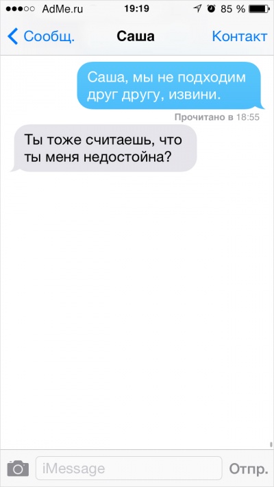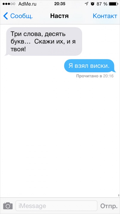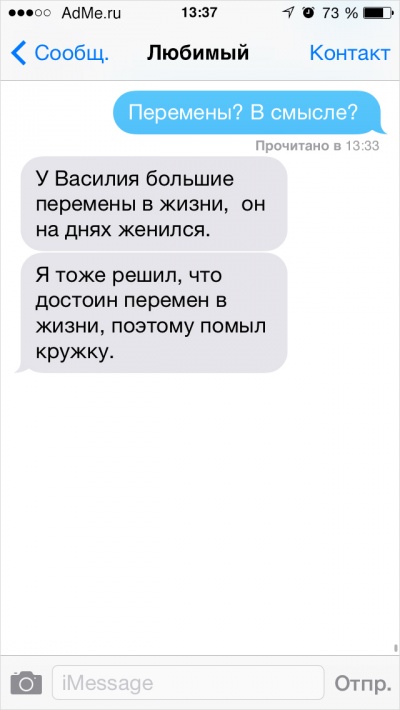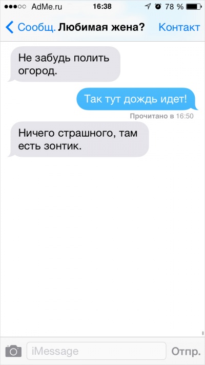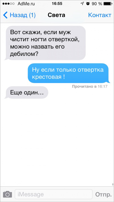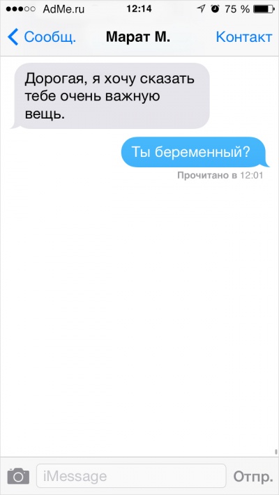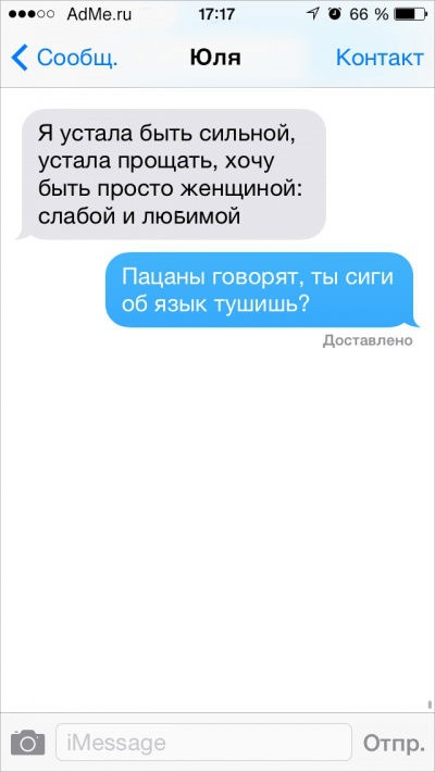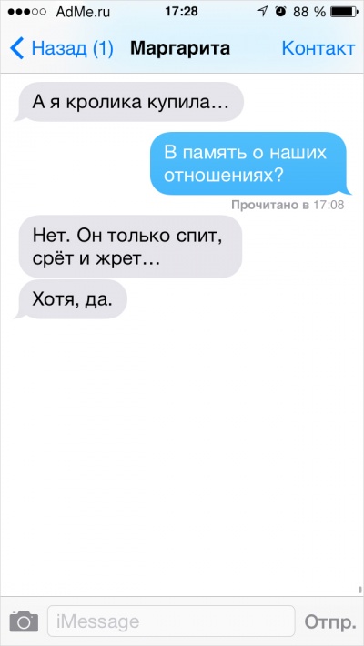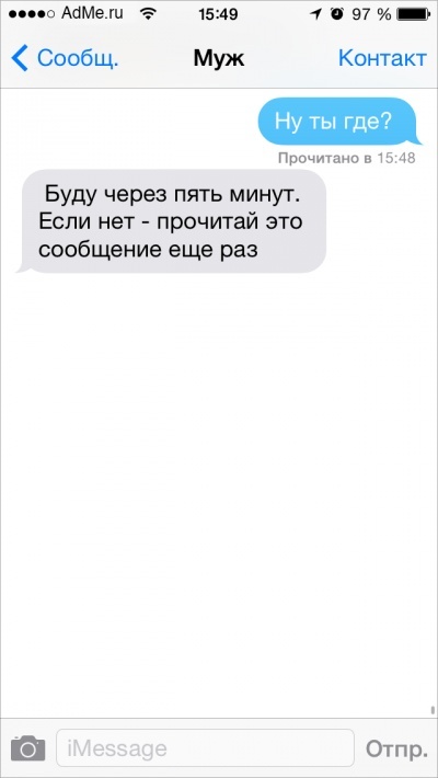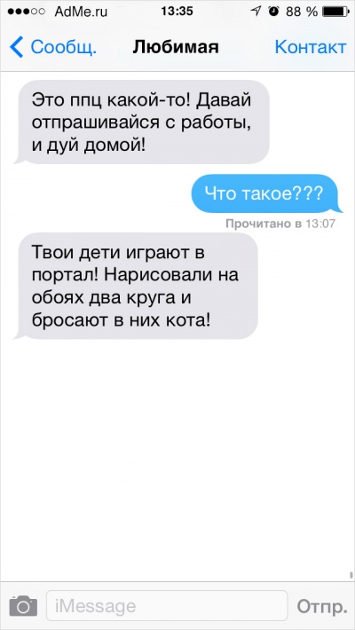 В век мобильных телефонов SMS-сообщения стали неотъемлемой частью нашей жизни. С помощью гаджетов стало намного проще документировать забавные моменты из жизни и делиться ими в Интернете. Сайт AdMe.ru собрал SMS, которые могли отправить друг другу только самые близкие люди - мужья, жены или возлюбленные. Читайте и узнавайте себя.