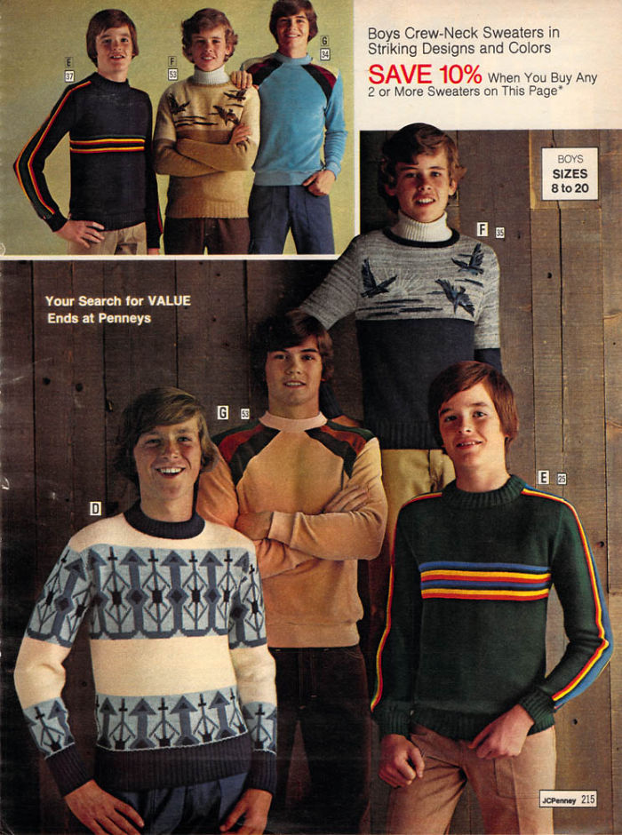 Эти фотографии мужской моды из каталога 1970-х годов пестрят яркими цветами, узорами, расклешенными брюками с завышенной талией и огромным разнообразием трикотажа. Именно в 70-е стремительно упали цены на синтетику, и мужчины бросились наряжаться.
