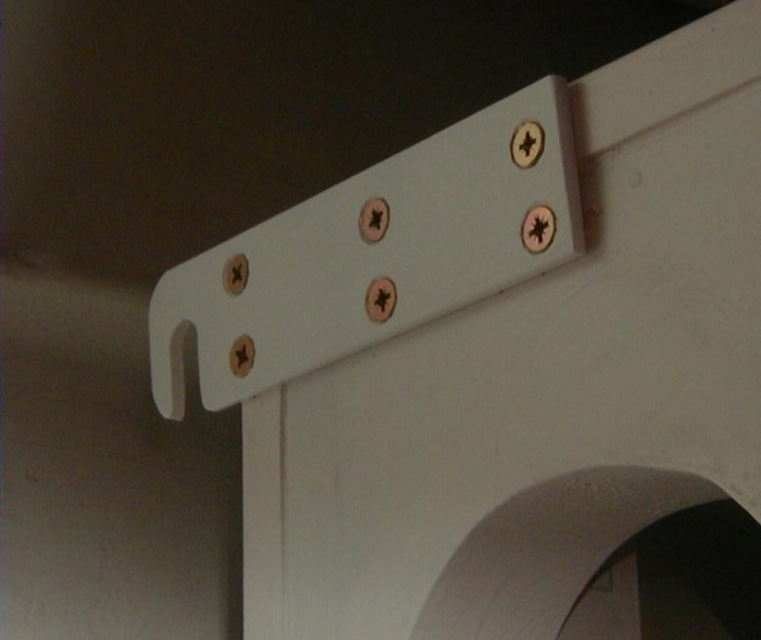 Далее следует установить "уши" - крепеж, с помощью которого коллектор крепится к стене, и защитить древесину защитной краской. Затем пустую коробку необходимо разместить на стене и наметить место, где будет отверстие для входа горячего воздуха и выхода холодного. В пробитые в стене отверстия вставляется труба из подручного материала.