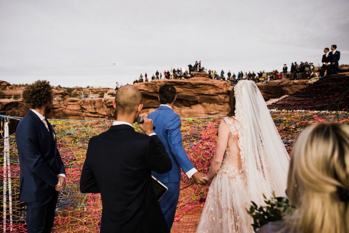 Свадебная церемония влюбленных из США прошла на высоте 122 метра. Молодые связали себя узами брака на растянутой сетке над каньоном Моаб, который находится в южной части Юты и славится своим марсианским пейзажем. Фотографы Эбби и Каллен Хирнс запечатлели экстремальное бракосочетание, сделав потрясающие и захватывающие дух снимки.