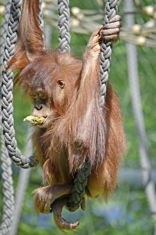 Тогда орангутаны направляются в безопасное место, передвигаясь по деревьям. "Для передвижения взрослые приматы используют вес тела, прыгая с ветки на ветку. Однако легкий вес детенышей не позволяет сгибать ветки и перемещаться, поэтому мамы создают так называемые живые мосты и переправляют детей", - объясняет специалист по приматам.
