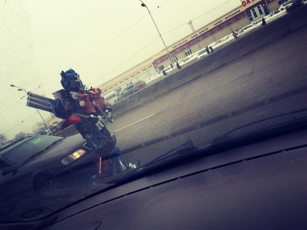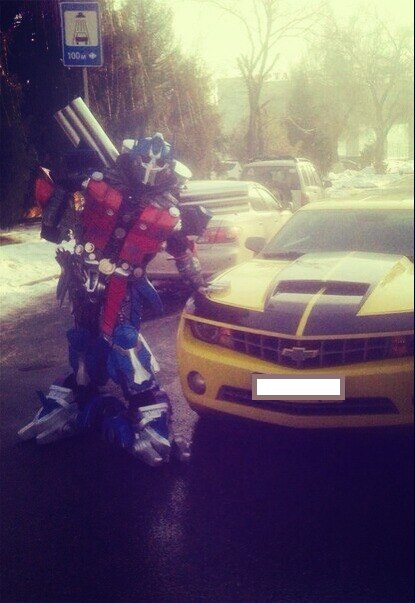 Трансформеры добрались до Алматы. Очевидцы сделали несколько фотографий человека в костюме Оптимуса Прайма, разгуливающего по улицам города. Фотографии выложил паблик "Типичная Алма-Ата".