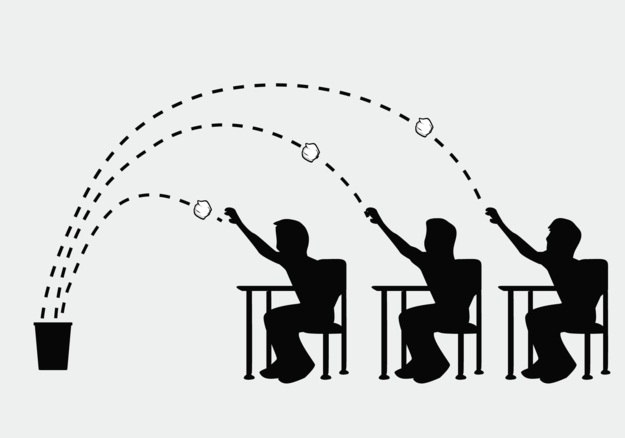 Ребята начали бросать бумагу и, как и предполагалось, большинство (но не все) из сидящих на первых рядах попали в корзину. И лишь несколько из тех, кто сидел на задних партах, справились с задачей.