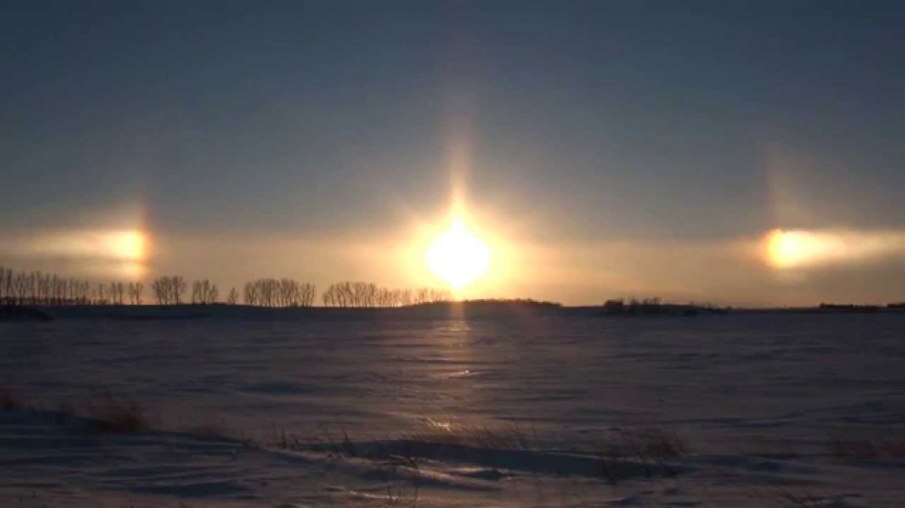 Классический паргелий, эффект "трех солнц" - самая распространенная разновидность гало, появление у Солнца "двойников" на расстоянии в 22 градуса и примерно на той же высоте.