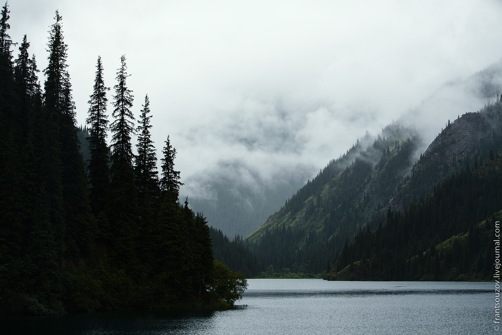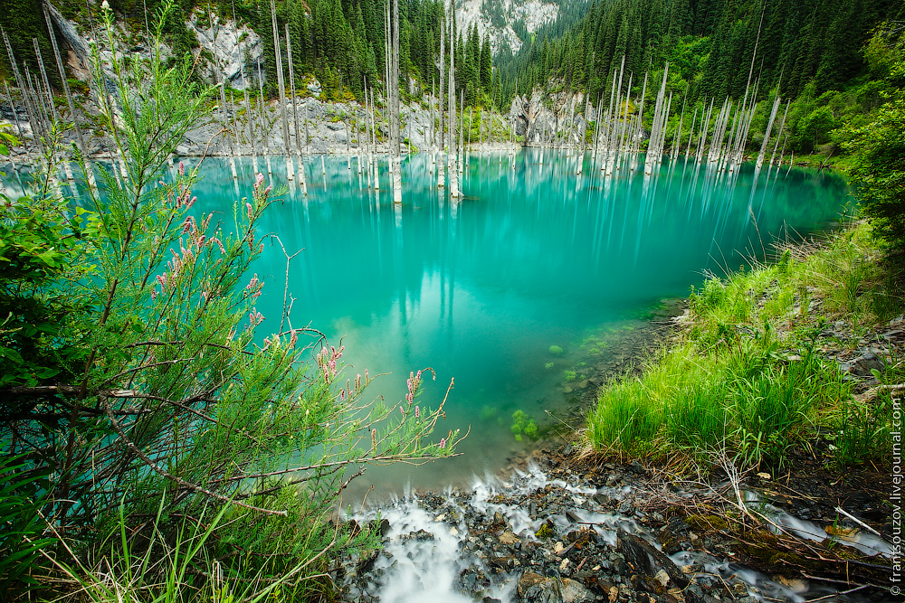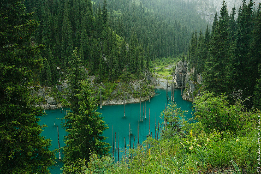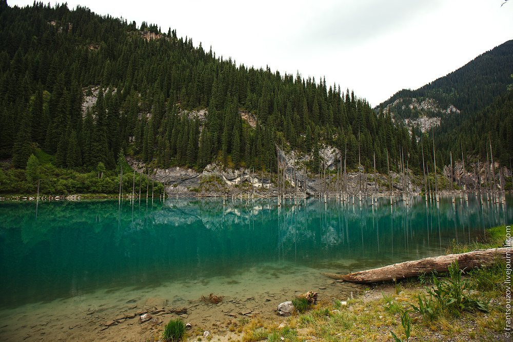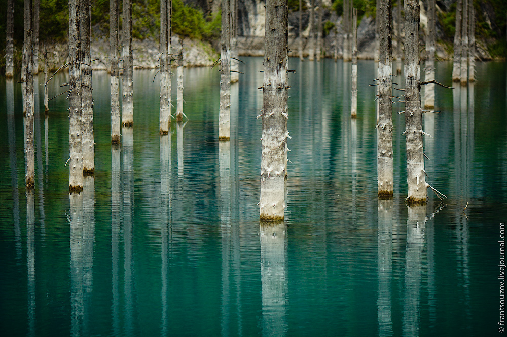 "Горное озеро на высоте 2000 метров, чистейшая вода нереального бирюзового цвета и мертвый лес, стоящий среди нее, - когда-то здесь росли деревья. Вдалеке плавает утка и орет на всю округу, а эхо от ее кряканья разносится в горах... Это утро просто взорвало мой мозг", - пишет Французов после посещения озера Каинды.