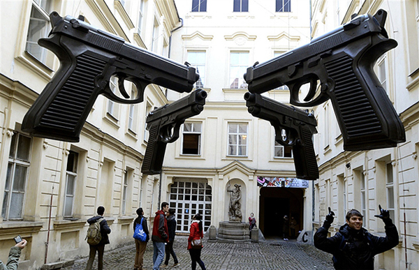 Чешский художник Давид Черный установил словно парящие в воздухе четыре пистолета. Название проекта говорит за себя: Guns
