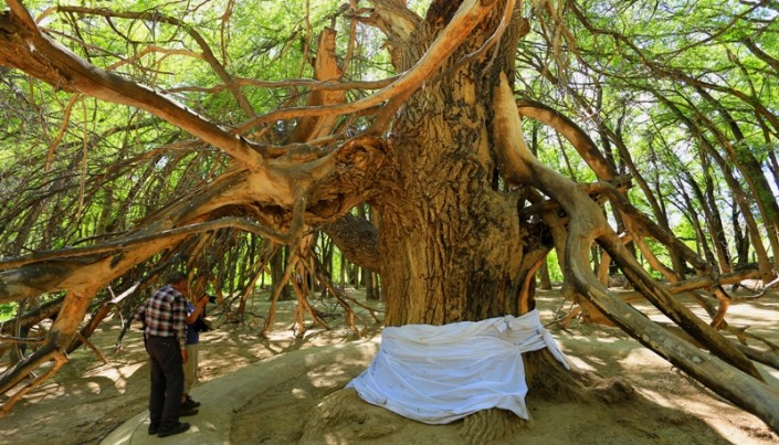 700-летний карагач недалеко от Жаркента в Алматинской области. Поскольку дерево считается священным, любой желающий может загадать желание, прижавшись к могучему стволу и привязав платочек к опустившимся под тяжестью времени ветвям. Размер платочков прямо пропорционален масштабам желания: ветви украшены ленточками, платками и порой даже простыней.