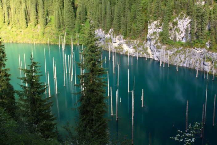 Озеро располагается в Кунгей Алатау среди огромного хвойного леса на высоте более 2000 тысяч метров над уровнем моря. Когда-то на его месте росли деревья, сейчас они находятся посреди самого озера, придавая ему и без того необычайный вид.