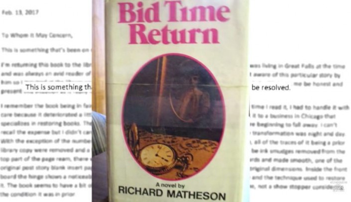 В этом году в библиотеку Грейт-Фолс, США, пришла весьма необычная посылка, в которой лежал роман фантаста Ричарда Мэтисона "Где-то во времени".
