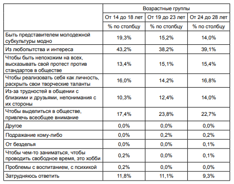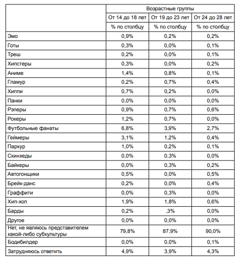 При этом почти половина молодежи оказалась безразличной к сверстникам, вступившим в субкультуры. Положительно к ним относятся 17,9 процента молодых людей. Отрицательное отношение показали 21,1 процента опрошенных. Среди молодых людей только 23,3 процента заявили, что среди их друзей и знакомых есть представители молодежных субкультур.