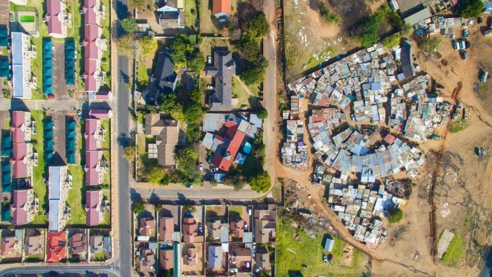 Кадры, с высоты птичьего полета показывающие, как бараки в крупных городах соседствуют с коттеджами и полями для гольфа, сделаны фотографом Джоном Миллером в рамках проекта Unequal Scene. Миллер работает над проектом вот уже два года, так как считает, что неравенство - одна из самых острых проблем современного мира.
