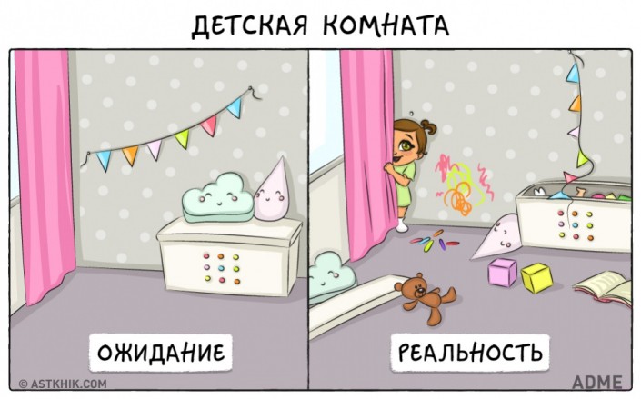 Представления о том, как будет есть или спать ребенок, могут сильно отличаться от реальности. После рождения малыша родители делают много неожиданных открытий о себе, ребенке и новой совместной жизни. Посмотрим на иллюстрации о ярких моментах из жизни семейной пары, у которой появился малыш.