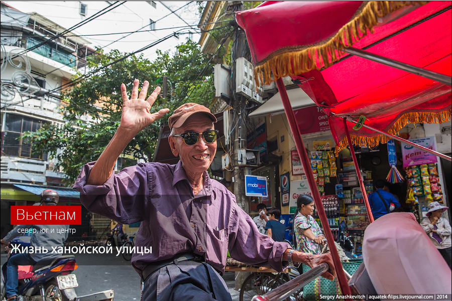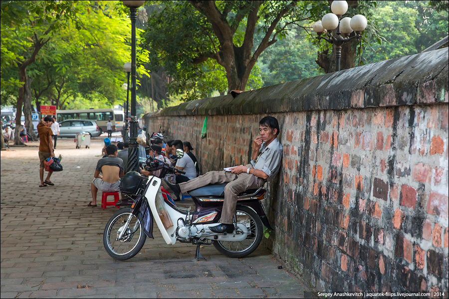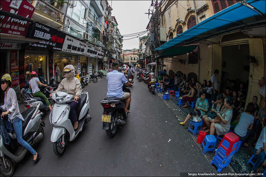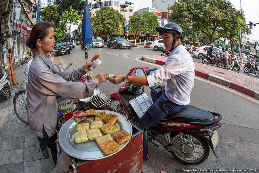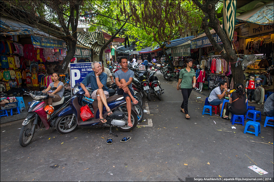 Обычная улица в центре вьетнамской столицы, обычные люди в своей обычной каждодневной суете. И эта суета для каждого своя. Кто-то развешивает футболки и рубашки в торговых палатках, кто-то суетливо готовит блюда в уличном фастфуде, кто-то спешит с корзинами фруктов в поисках покупателя, а кто-то сидит на своем мотобайке в ожидании клиента, чтобы подвезти.