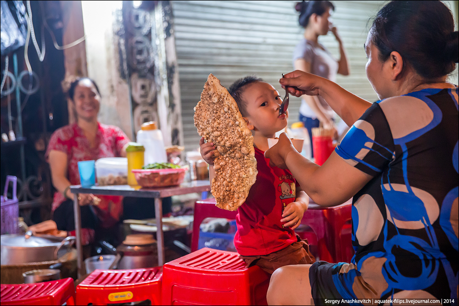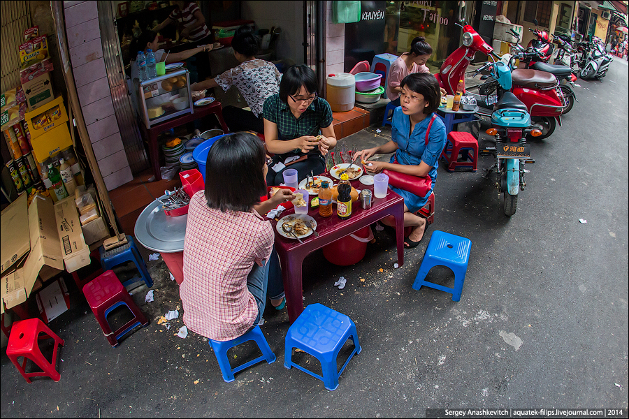 Особая тема - уличное питание. Вьетнамцы обожают есть, сидя на улице. В Ханое просто огромное количество забегаловок, которые полностью занимают все тротуары и которые всегда полны народу, жующего разную снедь.