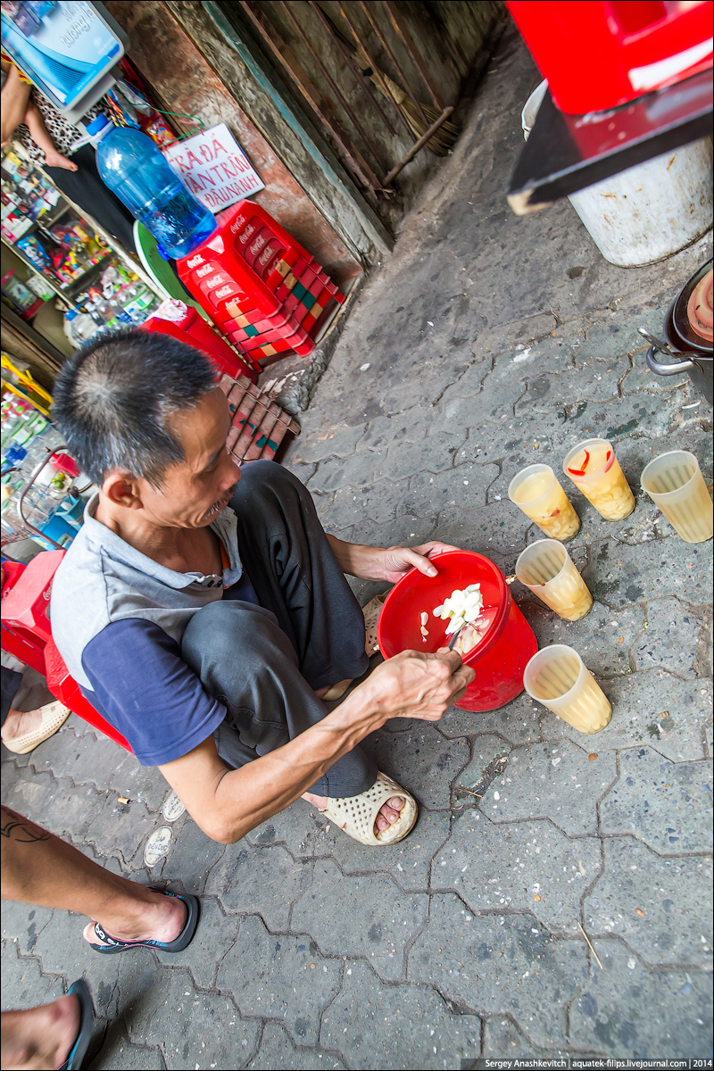 Наступает вечер. Это время, когда закрывается большая часть торговых лавок и открываются закусочные - все начинают есть на улицах. Готовят просто на коленках.